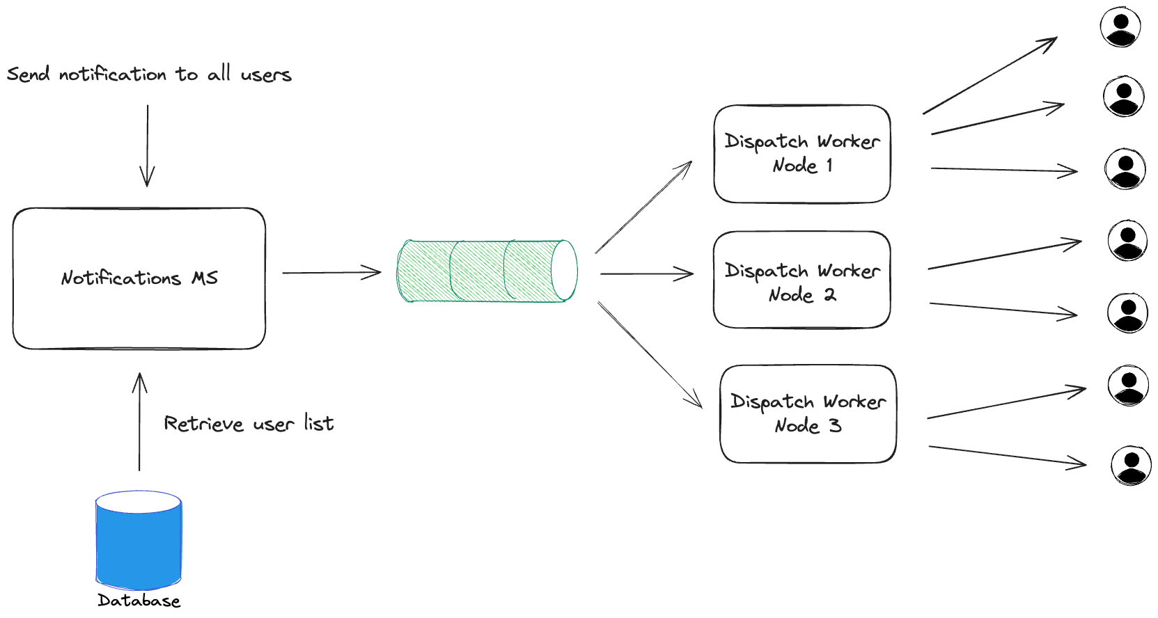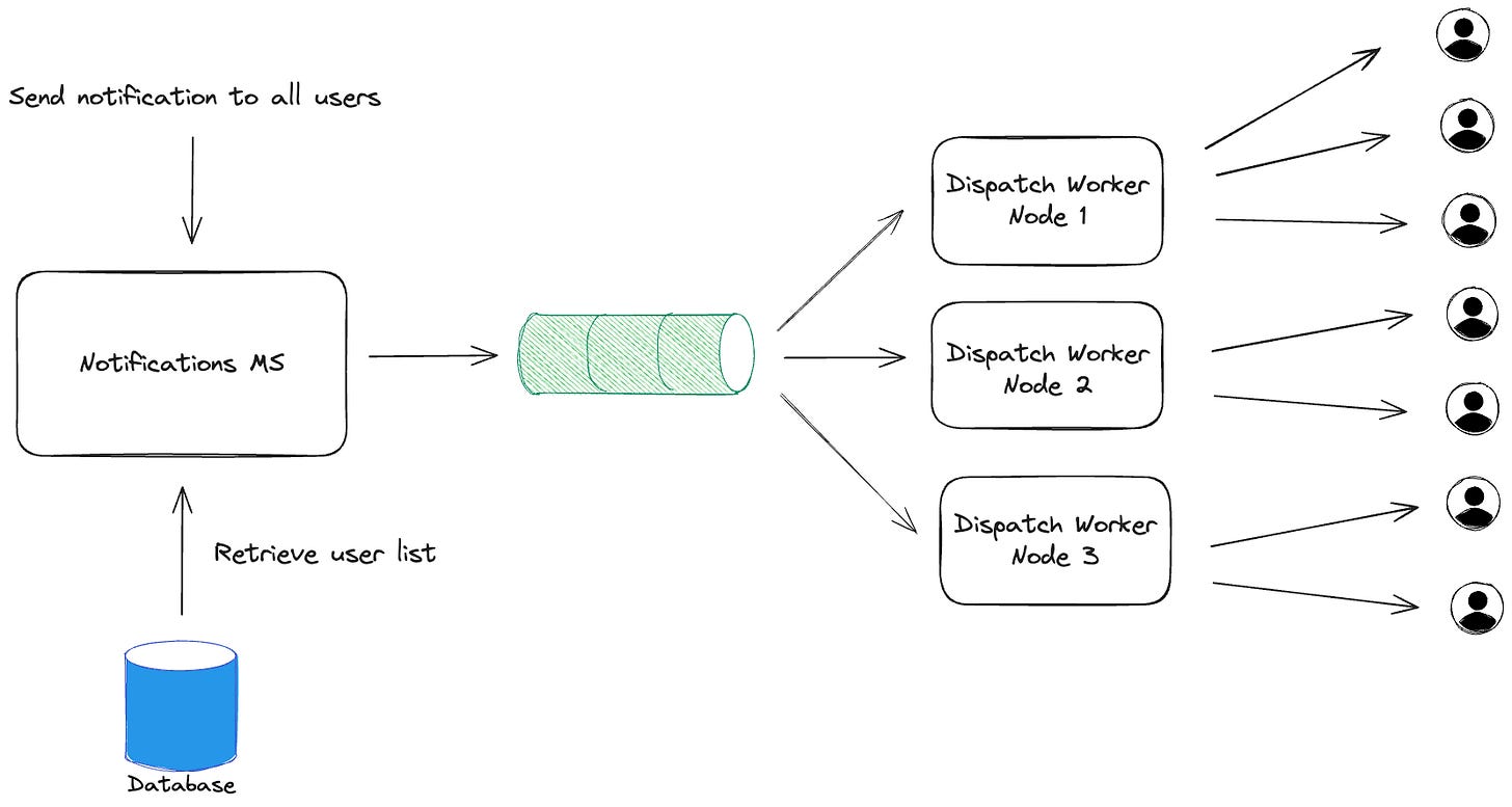 In particular, system components might not receive the same load to process requests. One service might create a notification that needs to be sent to millions of users and forward it to a notifications service. Each user message would need to be sent separately putting a significant load on the dispatch component. Instead of doing all the work at once, the service could split the work into chunks, put them into a queue and tackle at a comfortable pace.